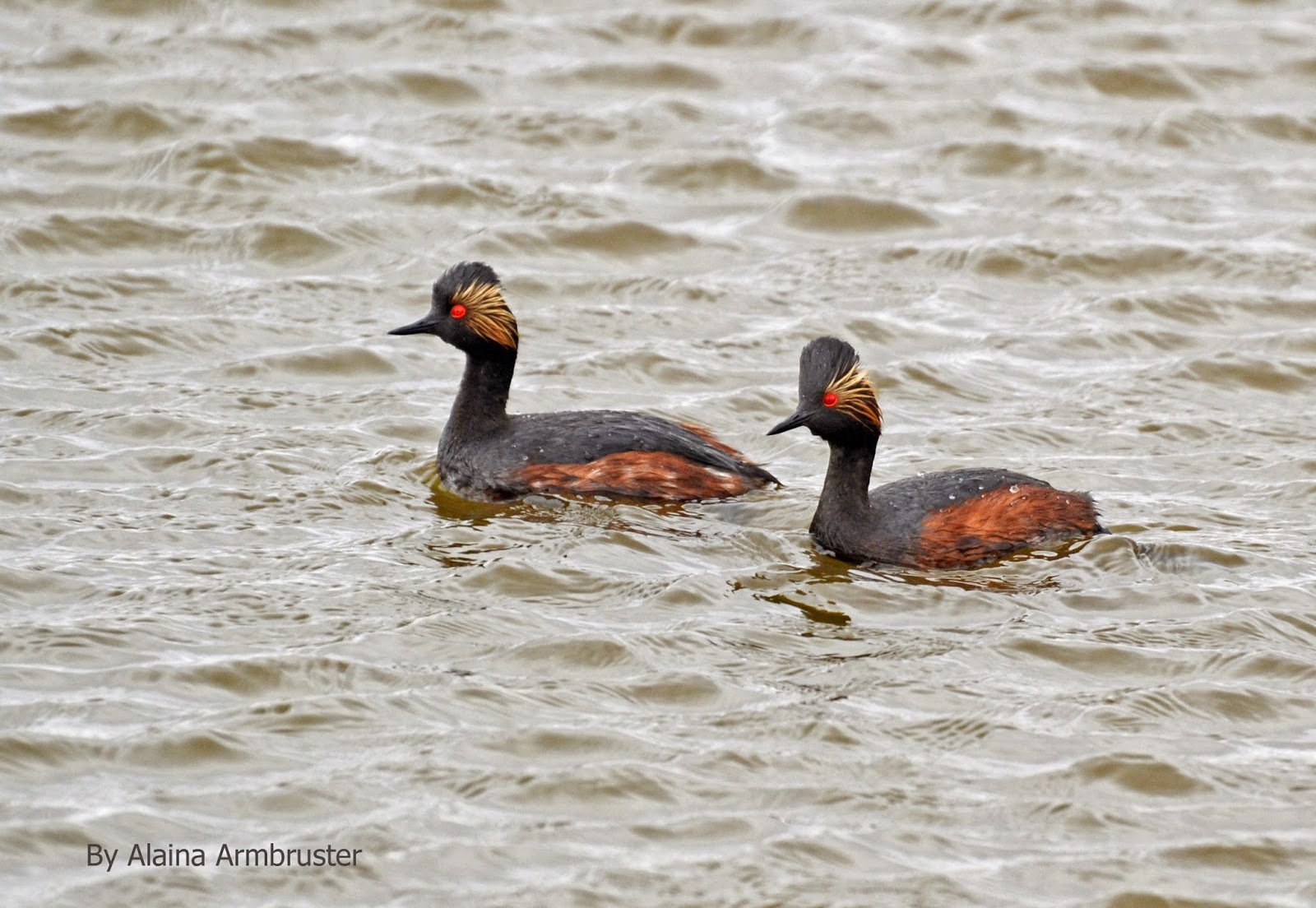 A pretty pair of Eared Grebes... Synchronized grooming time!